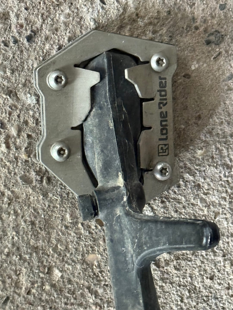 La extensión para el pie del caballete lateral Lone Rider mejora el caballete lateral original al aumentar su superficie de apoyo, lo que proporciona una estabilidad superior al aparcar la motocicleta. Diseñada para ofrecer el máximo apoyo, garantiza que la moto se mantenga estable en superficies blandas o irregulares. Con esta mejora esencial, podrás aparcar con confianza en arena, barro o grava sin preocuparte de que tu GS se hunda o se vuelque.